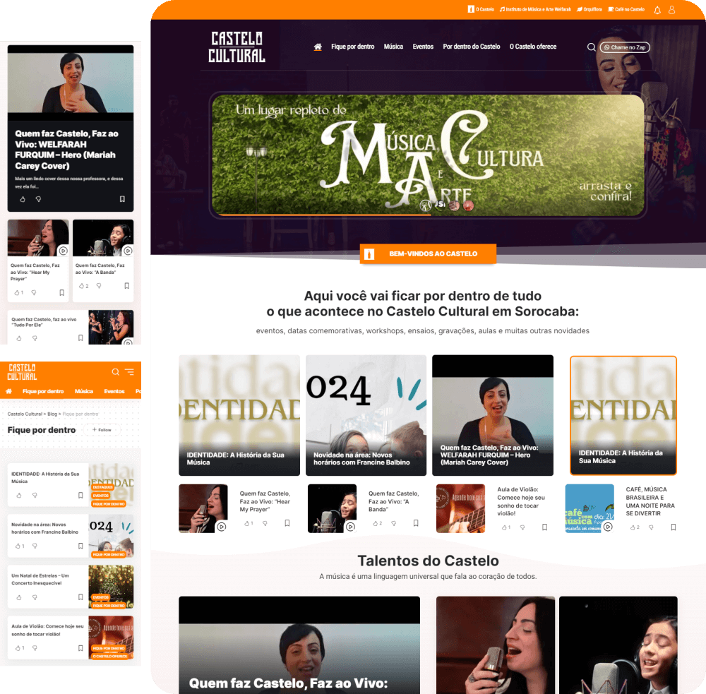 Muitas escolas buscam apenas divulgar cursos, mas nós entregamos um portal de imersão. Nosso desenvolvimento de site para o Castelo Cultural destaca nossa expertise em: