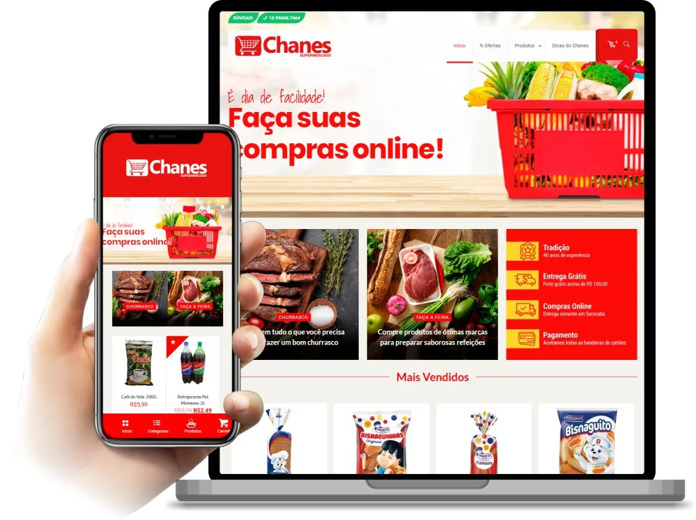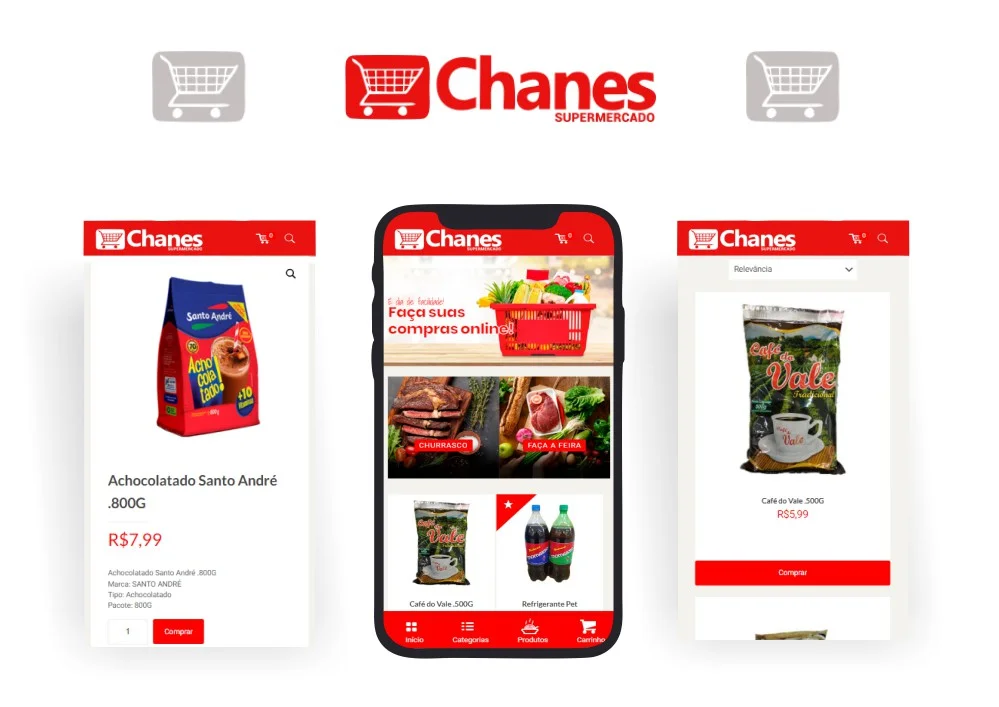 Desenvolvemos o e-commerce do Supermercado Chanes, com um design simples e intuitivo seguindo sua identidade visual, como também uma versão responsiva do site similar a de um aplicativo.