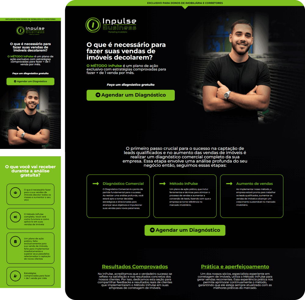 O projeto Impulse Business exigiu uma Landing Page que estabelecesse autoridade e convencesse donos de imobiliárias e corretores a agendar um diagnóstico comercial gratuito.