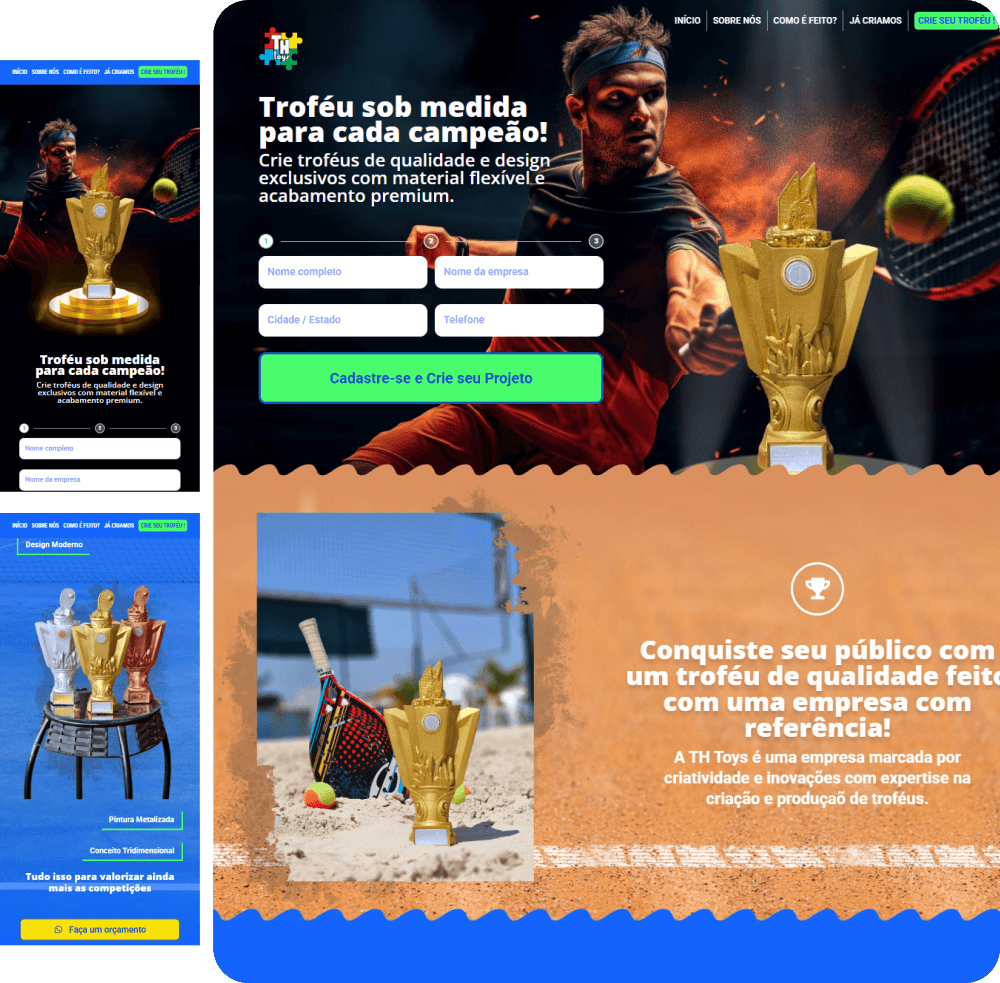 Na Agência Dórz Marketing & Branding, transformamos a expertise industrial em resultados digitais. O projeto TH Plastic exigiu uma Landing Page que mostrasse a qualidade premium dos troféus personalizados, gerando orçamentos diretos (B2B).