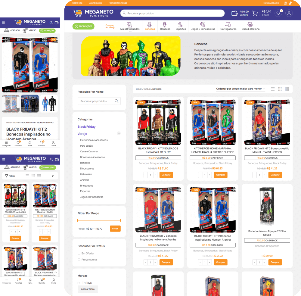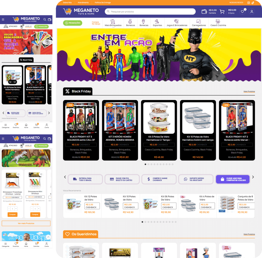 Integração e Mobile-First: O e-commerce foi construído para ser altamente performático e responsivo, garantindo que o grande volume de tráfego de campanhas sazonais e o público que busca “comprar brinquedos online” tenha uma experiência fluida e segura.