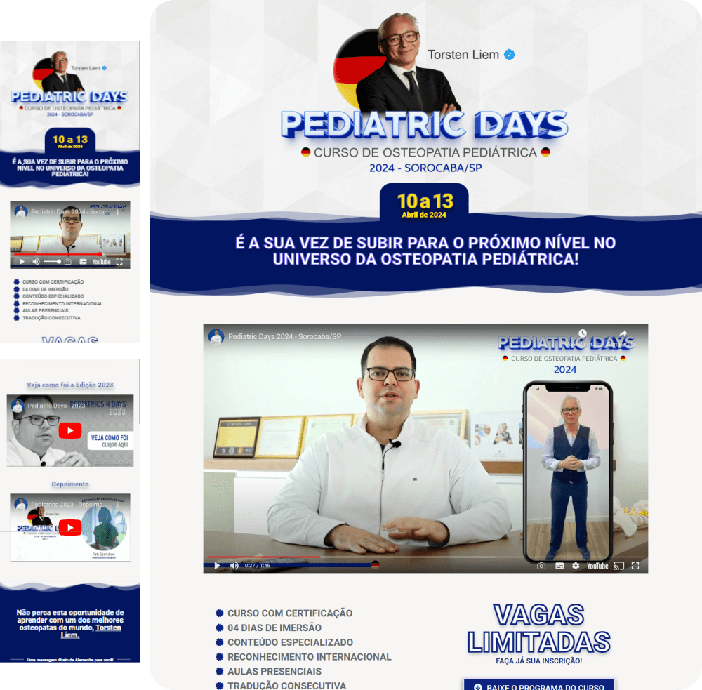 O projeto Pediatric Days (Curso de Osteopatia Pediátrica com Torsten Liem) exigiu uma Landing Page que transmitisse autoridade internacional e urgência para o segmento de saúde.